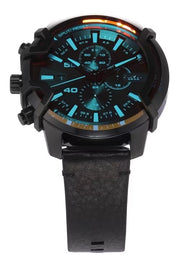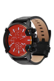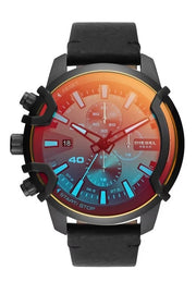The leather rugged band, when paired with the chrono masculine dial, gives you a timepiece that can be worn to both work and after work. This Diesel Griffed watch features a red and blue iridescent dial with white stick indexes and three sub dials, chronograph movement and black leather strap.