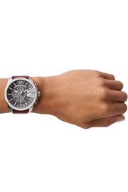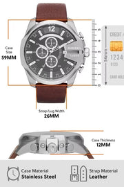 This modern and stylish Diesel watch for men comes with a greyish black chronograph dial with three sub dials, a day function, luminescent hour and minute hands and minute markings on its perimeter encased in a stainless steel case. The brown leather strap adds to the simplicity making it a perfect fit for both formal and casual wear.