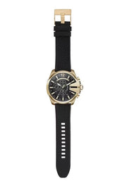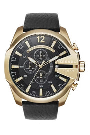 Designed for the dazzler in you, the Mega Chief chronograph watch by Diesel has a royal colour combination of black and gold that will instantly grab everyone’s attention. The black dial with a three hand movement is beautifully contrasted against the luminous gold toned hands and index hour markers. It is encased in an equally special gold plated stainless steel case. The black leather strap holds the watch in place using a traditional buckle.