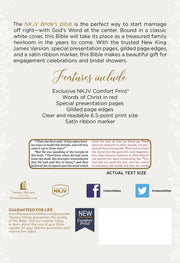 The NKJV Bride’s Bible is a beautiful and meaningful way for a bride to begin her marriage—with God’s Word at the center. Bound in elegant white leathersoft (imitation leather), this Bible is designed to become a cherished keepsake and a lasting family heirloom.