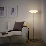 The IKEA TALLBYN Floor Lamp combines classic elegance and modern functionality, making it a perfect addition to any room. The nickel-plated finish and opal white glass lampshade create a warm, cozy atmosphere with soft, ambient lighting.