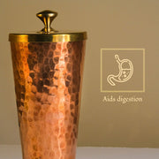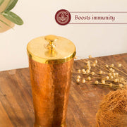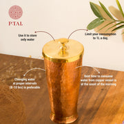 Kupfer, eines der ältesten vom Menschen genutzten Metalle, ist ein reines Element und kommt als natürliches Mineral vor. Der beste Start in den Tag ist in Kupfer gelagertes Wasser. Kupfer tötet nicht nur schädliche Bakterien im Wasser ab, sondern liefert Ihrem Körper auch wichtige Nährstoffe und unterstützt deren Aufnahme. Es verbessert Ihre Haut und reduziert die vorzeitige Alterung des menschlichen Körpers durch Umweltverschmutzung. In der heutigen schnelllebigen Welt brauchen wir das Gesundheitsgeheimnis unserer Vorfahren. Der einfache Austausch Ihrer Stahlgefäße durch Kupfer hilft, den Cholesterinspiegel zu senken, die Schilddrüse zu kontrollieren und Ihr Immunsystem zu stärken. Bringen Sie etwas Abwechslung in Ihr Leben, indem Sie Utensilien aus reinem Kupfer kaufen und traditionelle Gesundheitsmethoden in modernem Design wiederbeleben, um Ihr Wohlbefinden zu steigern. Der Kupferbecher hilft Ihnen, das Geschenk der Gesundheit und Kultur zu fördern! Er ist eines der Produkte, die für die indische Kultur von großer Bedeutung sind.