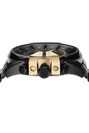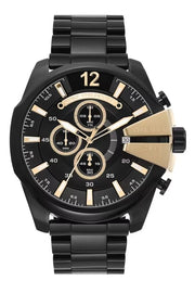 Dieser Chronograph Mega Chief von Diesel für Herren rundet Ihren Look perfekt ab. Mit leuchtenden goldfarbenen Zeigern und Indexen wird das runde schwarze Zifferblatt durch ein Edelstahlarmband fixiert, das mit einem Doppeldruckknopf umgeschlagen wird und wiederum in schwarz ionenplattiertem Edelstahl eingefasst ist. Kombinieren Sie ihn mit Ihrer Freizeitkleidung und setzen Sie ein umwerfendes Statement.