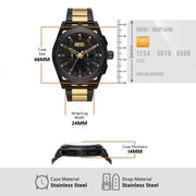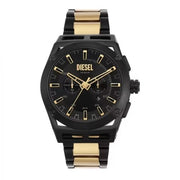 Die 48-mm-Timeframe-Uhr von Diesel verfügt über ein schwarzes Sunray-Zifferblatt, ein Chronographenwerk und ein zweifarbiges Edelstahlarmband.