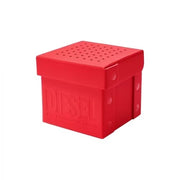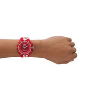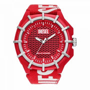 The Diesel 51mm Framed watch includes a castor oil case, red brushed dial, solar-powered movement, and an eco-friendly red strap made of 100% recycled post-consumer polyethylene terephthalate (PET) and leather from a LWG Certified tannery.