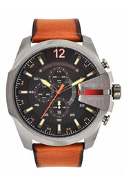 - This powerful Diesel Mega Chief watch for men boasts a strong and durable design, featuring a sleek black dial with three sub-dials, silver dash markings, and silver-toned hands that enhance its overall style. With a brown leather strap and gunmetal ion-plated stainless steel case secured by a tang buckle, this timepiece is the perfect accessory to elevate your polished western attire.