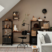 The FJÄLLBO laptop table in black combines rustic charm with industrial strength. Measuring 100x36 cm, its slim design makes it ideal for small spaces while still providing enough surface for a laptop, writing, or display items. The tabletop is made of solid pine, giving each desk a unique look with natural variations in the wood grain, while the powder-coated steel frame ensures stability and durability. Its open design keeps the area light and easy to maintain, making it a practical and stylish choice for modern or industrial-inspired interiors