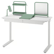 The RELATERA desk combination in white and light grey-green offers a clean and practical workspace solution. With a width of 117 cm, it provides ample space for daily tasks while still being compact enough for smaller rooms. The melamine tabletop is durable and simple to maintain, and the powder-coated steel frame ensures strength and stability. Its modern two-tone color scheme blends easily into contemporary interiors, making it ideal for study areas, home offices, or workspaces.
