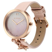 The Titan women's purple unending beauty quartz analog leather strap watch combines sophistication with modern charm. Its mother of pearl dial gives off a subtle, iridescent glow, making it a striking piece for any occasion. The pink leather strap complements the sleek design of the watch, adding a touch of warmth to its elegant appearance.