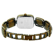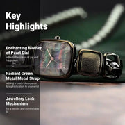 The green metal strap offers a bold, fashionable look while ensuring durability. Its unique green shade complements the overall design, making it versatile enough to match a wide range of outfits. The jewellery clasp not only ensures a snug fit but also adds a touch of femininity, making the watch easy to wear and remove.