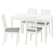 The NÄSINGE / NÄSINGE dining set blends modern simplicity with soft comfort. The clean white table pairs beautifully with four chairs featuring a warm beige-grey upholstered seat, giving your dining space a fresh yet cozy appearance. Designed for everyday use, the set offers stable steel construction, a wipe-clean surface, and comfortable seating—ideal for small families or compact dining rooms that want a light, modern Scandinavian look.
