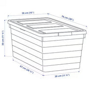 Practical for storing everything, from seasonal clothes and shoes to sports items and tools. Fits well on the shelves in the IVAR storage series with depths of 50 cm and shelves in the BOAXEL series with depths of 40 cm, as well as in other storage with shelves that are at least 38 cm deep. The built-in locking function keeps the lid in place which protects your things from dirt and dust. The contents are kept fresh since the lid’s design allows air to circulate, even when the box is closed. You can easily stack boxes of different sizes, as they’re made to fit each other. You can easily organise and find your things since there are two small areas you can write on or attach labels to.