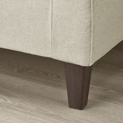 • Traditional design with a fitted cover, piping, and visible wooden legs for a sophisticated appearance