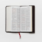 The NKJV Checkbook Bible is a compact, portable Bible designed for convenience and travel. Its wallet-style bonded leather cover with a snap closure provides durability and protection. Though compact in size, it contains the full New King James Version text laid out in a clear, double-column format. The red-letter feature highlights the words of Christ for easy reference. Lightweight and slim, it fits easily into bags, purses, or even large pockets, making it an ideal choice for those on the go who want to keep a Bible close at hand.