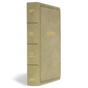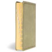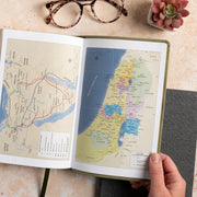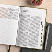 The KJV Large Print Personal Size Reference Bible in Sage Suede Soft Leather Touch offers a blend of portability and readability. Its 11.25-point type size ensures comfortable reading, while the compact dimensions make it ideal for personal study, devotional reading, or church use. The Smyth-sewn binding allows the Bible to lay flat when open, enhancing usability. Additional features include end-of-paragraph cross-references, topical page headings, a concordance, full-color maps, and a presentation page for gift-giving. The thumb-indexed design facilitates quick navigation through the Scriptures.