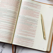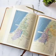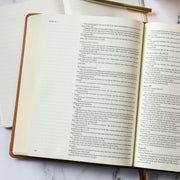 The KJV Note taking Bible, Large Print Edition, Camel Leather Touch is thoughtfully designed to enhance personal Bible study and sermon preparation. Featuring the revered Pure Cambridge Edition of the King James Version, this Bible offers a single-column layout with generous two-inch lined margins, providing ample space for journaling, reflections, and notes. The 9.5-point large print ensures comfortable reading, while the Smyth-sewn binding allows the Bible to lay flat for ease of use. Additional features such as red-letter text for the words of Christ, topical subject headings, a concordance, and a one-year Bible reading plan make this edition a valuable resource for both personal growth and teaching. The elegant Camel Leather Touch cover adds a touch of sophistication, making it a cherished keepsake or a thoughtful gift.