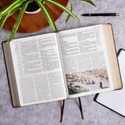 The KJV Study Bible, Large Print Edition in Saddle Brown LeatherTouch offers a comprehensive study experience with the trusted King James Version text. Its large 11.5-point type ensures readability, while the durable Smyth-sewn binding allows the Bible to lay flat for easy reading. The Saddle Brown LeatherTouch cover provides an elegant and tactile finish. Ideal for both personal study and gifting, this edition combines timeless design with practical features for deep engagement with Scripture.