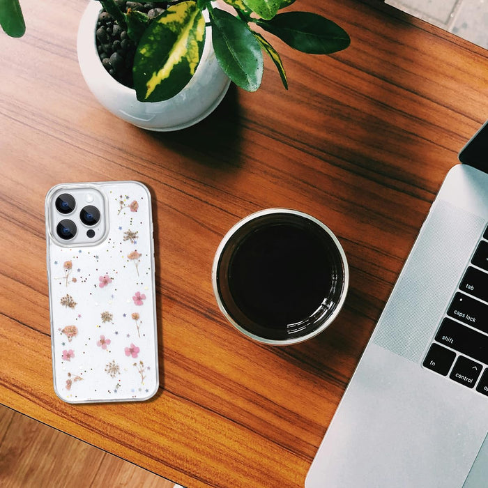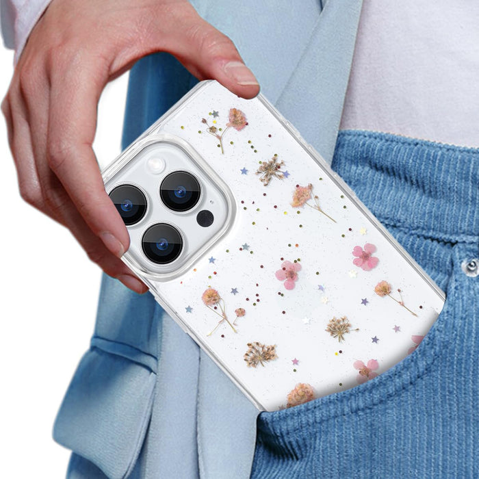 Enflamo Clear Silicone Case Glitter Little Floral Back Cover for iPhone 16 Pro | with Pressed Dry Real Flowers (Pink)