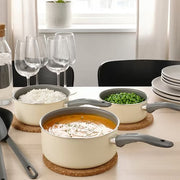 This set of 3 IKEA KAVALKAD saucepans provides reliable and easy-to-clean performance with a ceramic coating for quick heat transfer and easy release. Made of durable aluminium for even heat distribution, they are also perfect for energy-saving cooking. Available in grey/light beige, these pans make a stylish addition to any kitchen.