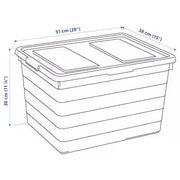 Practical for storing everything, from seasonal clothes and shoes to sports items and tools. The built-in locking function keeps the lid in place which protects your things from dirt and dust. Fits well on the shelves in the IVAR storage series with depths of 50 cm and shelves in the BOAXEL series with depths of 40 cm, as well as in other storage with shelves that are at least 38 cm deep. The contents are kept fresh since the lid’s design allows air to circulate, even when the box is closed. You can easily stack boxes of different sizes, as they’re made to fit each other. You can easily organise and find your things since there are two small areas you can write on or attach labels to.
