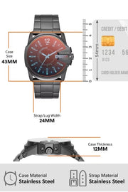 Upgrade your style with the timeless and edgy Diesel men's watch from the Mega Chief collection. This watch features an iridescent crystal, a sleek stainless steel bracelet and case, and a bold black dial with three subdials, silver indexes, and white tracking. Experience the perfect combination of comfort and fashion.