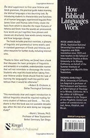 How Biblical Languages Work is an accessible guide for students beginning their study of biblical Hebrew and Greek. Authors Peter James Silzer and Thomas J. Finley explain the basic structures, grammar, and vocabulary of the two languages while offering strategies to master them effectively. Designed for seminary students, pastors, and Bible teachers, the book blends linguistic theory with practical learning tips, helping readers gain the skills needed to interpret Scripture more accurately in its original languages.