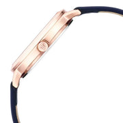 Crafted with mineral glass for added durability and paired with a blue leather strap, this watch offers both comfort and style. Its analog display and precise quartz movement ensure accurate timekeeping. The round metal case and buckle lock mechanism add to its practicality and secure fit.