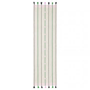 The MÄVINN table-runner is a handcrafted textile piece designed to bring warmth and personality to your dining space. Made from 100% cotton, it features a natural off-white base with a bold green stripe running down the center. Small hand-embroidered pink accents add a delicate, artisanal touch, while playful tassels in green, black, and pink decorate each short edge.