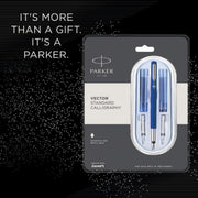 Elevate your writing with the Parker Vector Standard Calligraphy Fountain Pen. Its stainless steel nib and twin-channelled ink system ensure smooth and consistent ink flow. Whether using cartridges or filling from a bottle, this pen is versatile and stylish with a sleek stainless steel clip. Available in black or blue.