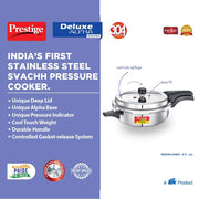 Prestige 4L svachh deluxe alpha senior pressure pan stainless steel outer lid ideal for 4-6 persons deep lid for spillage control gas & induction compatible silver